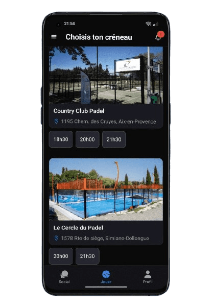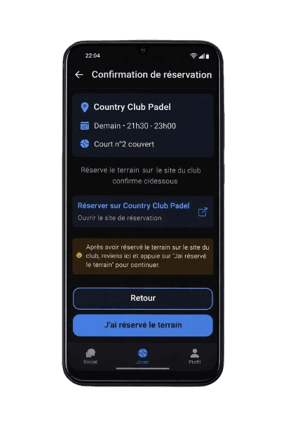Consulte les créneaux et accède directement au système de réservation du club pour finaliser ta réservation.